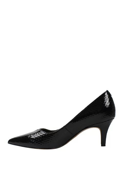 Make a style statement with these pumps by J. Renee, perfect for any occasion. These shoes display a sophisticated sweetheart topline pointy toe mid-heel design wrapped in beautiful snake print patent. Wear to any special occasion day or night. The Abigaile features a memory foam insole for added cushion and comfort.