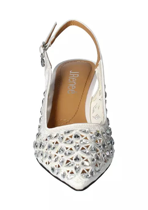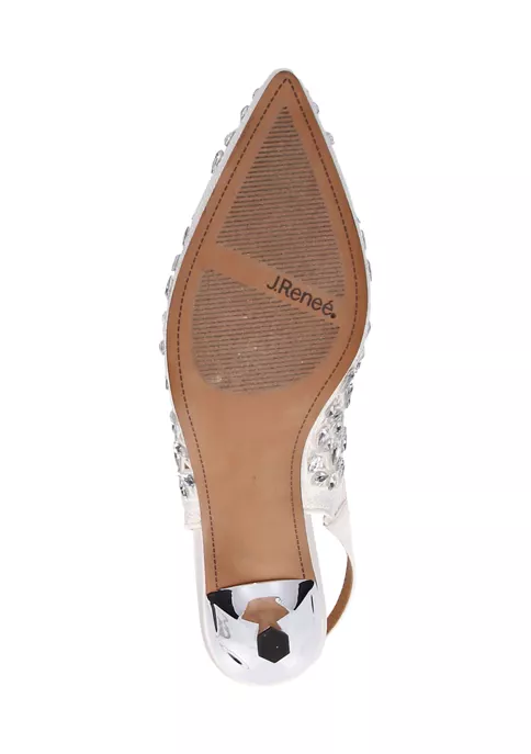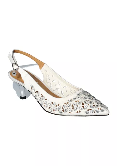 This sling back pump is made of satin/rhinestones with a synthetic lining and synthetic sole on a 2 inch heel.