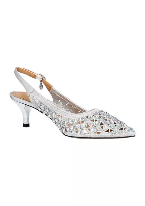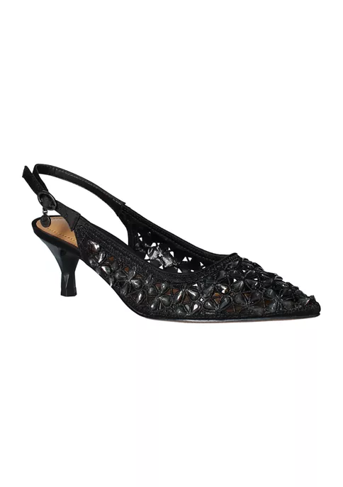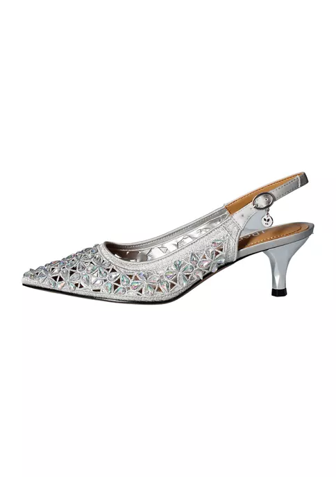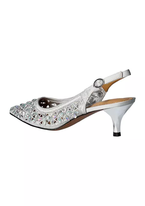 This sling back pump is made of satin/rhinestones with a synthetic lining and synthetic sole on a 2 inch heel.