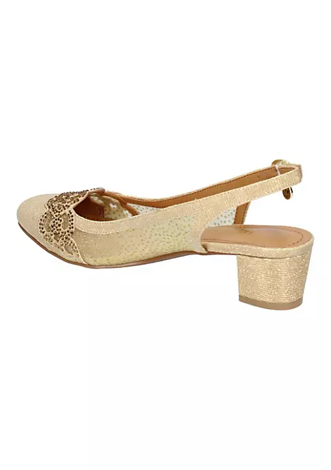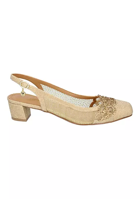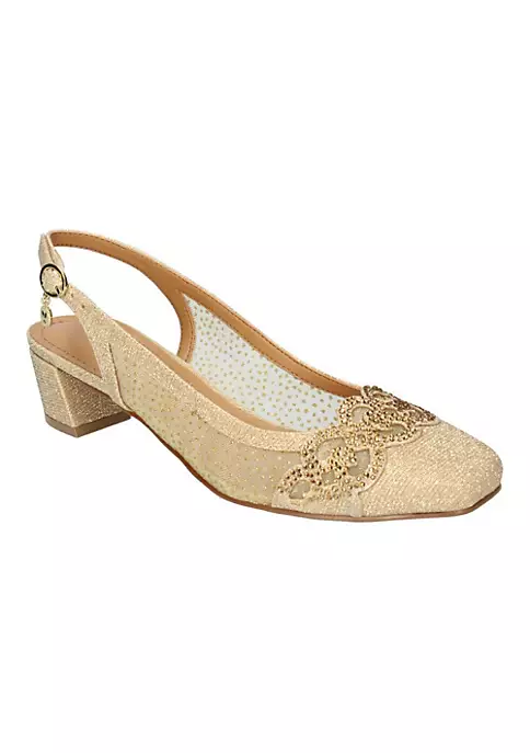 This fall women’s glitter/snow dot mesh square toe pump has a memory foam+latex insole and synthetic lining. This style also features a buckle closure on a 1.5 inch heel.
