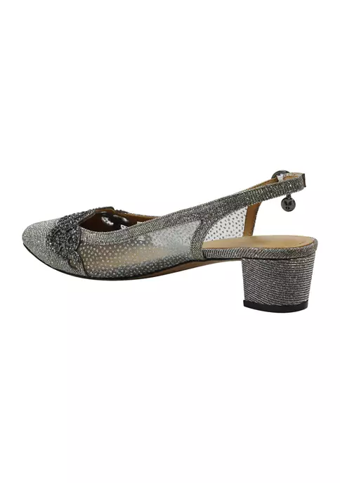 Sweet pretty and feminine lace detailing make up this low block heel sling. Dress up any day to evening occasion with this beautiful glitter and mesh fabric combination. The Faleece features a memory foam insole for added cushion and comfort. Make a style statement for any occasion with J. Renee’.