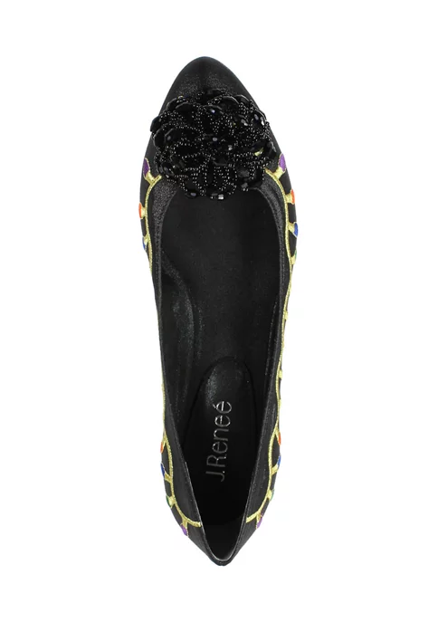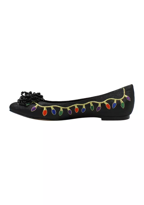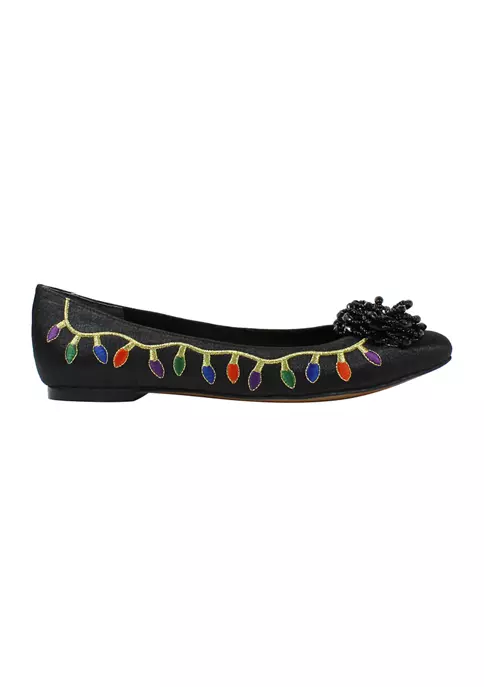 A whimsical string of lights embroidered onto fabric gives novelty to the holiday season. Adorned with a beaded ornament, this ballet flat is the perfect toss on with denim slacks or skirts for your holiday parties this year. The Gemlight features a memory foam insole for added cushion and comfort. Make a style statement for any occasion with J. Renee’.