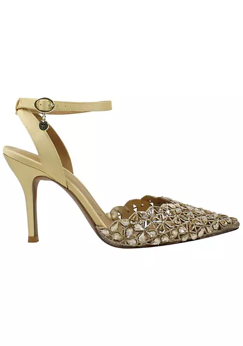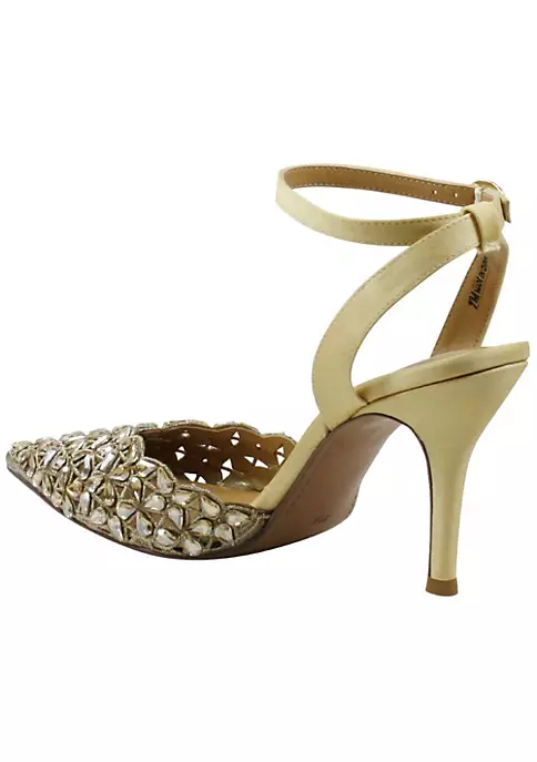 This spring women’s satin/rhinestones pointy toe pump has a memory foam+latex insole and synthetic lining. This style also features a buckle closure on a 3.25 inch heel.