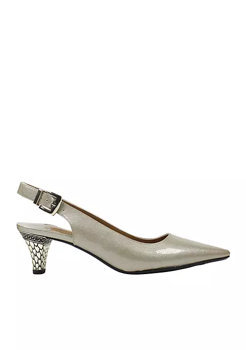 Feel chic and sophisticated with this special sling-back pump wrapped in pearlized patent with a gorgeous embossed metal heel. Be extraordinary day or night in anything from denim to dress. The Mayetta features a memory foam insole for added cushion and comfort with every wear. Make a style statement for any occasion with J. Renee’.