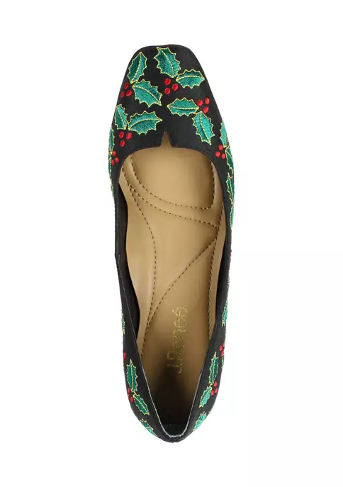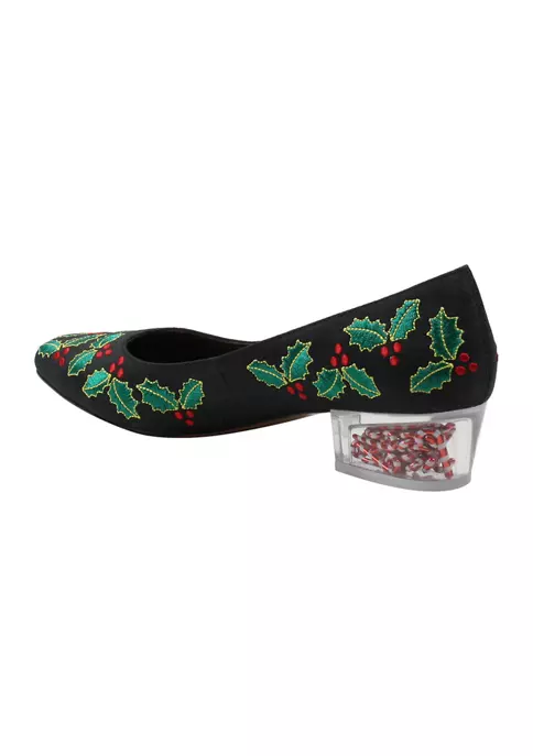 A beautiful holly embroidered Shantung novelty upper features a whimsical candy cane filled lucite heel. It’s the perfect holiday party style to wear with anything from denim to a little black or red dress. The Merrycane features a memory foam insole for added cushion and comfort. Make a style statement for any occasion with J. Renee’.