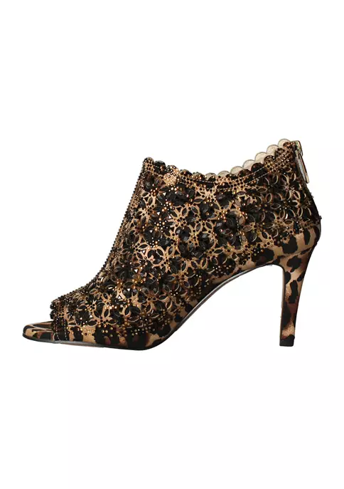 These shooties from J Reneé are made of fabric/rhinestones with a synthetic lining and synthetic sole on a 3.25-inch stiletto/pointed heel. They also feature a round-shaped open toe with a zipper closure.