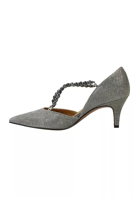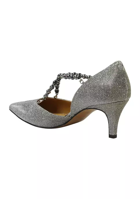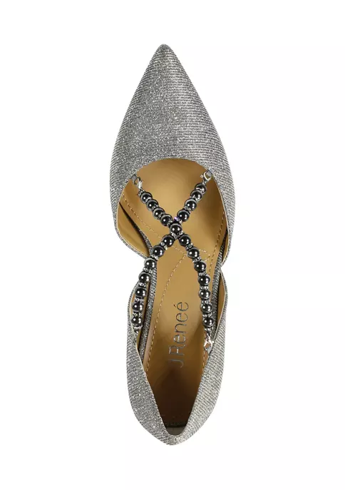 A detailed strap and subtly sparkly fabric enhance these stunning pointed toe Zayna pumps from J Reneé.