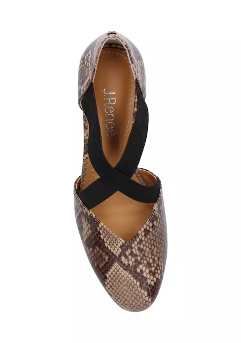 These flats from J Reneé are made of reptile print patent with a synthetic lining and synthetic sole on a 1.25-inch wedge heel. They also feature an almond-shaped closed toe with an elastic closure.